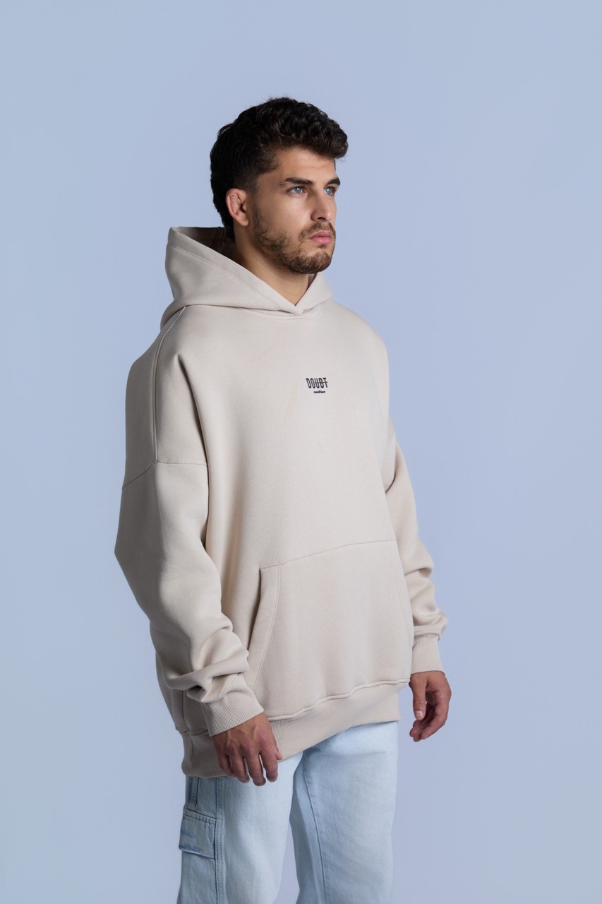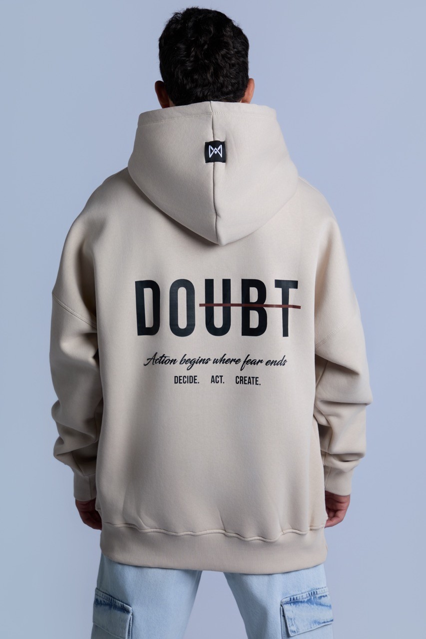 קפוצ’ון אוברסייז עם הדפס מינימליסטי ומסר חד – “DOUBT”.