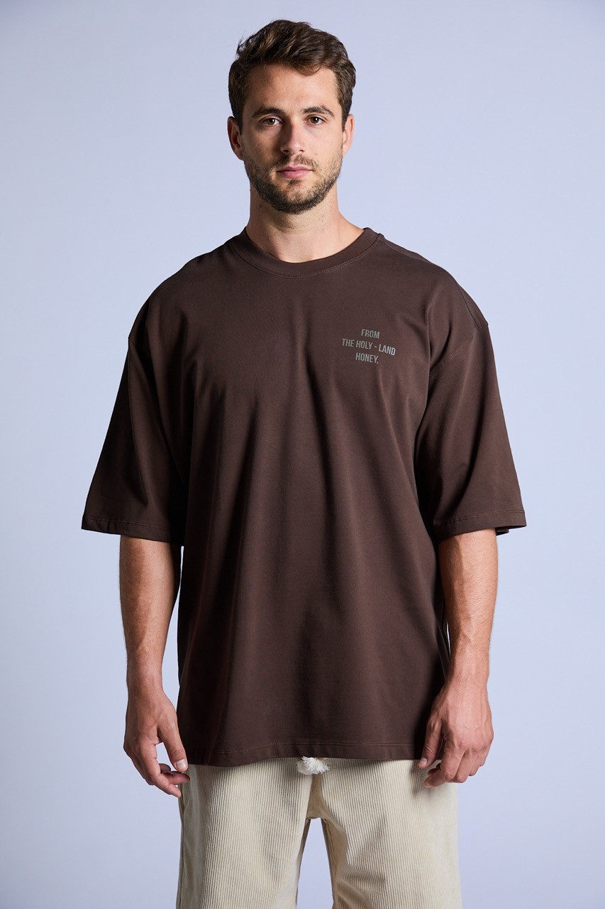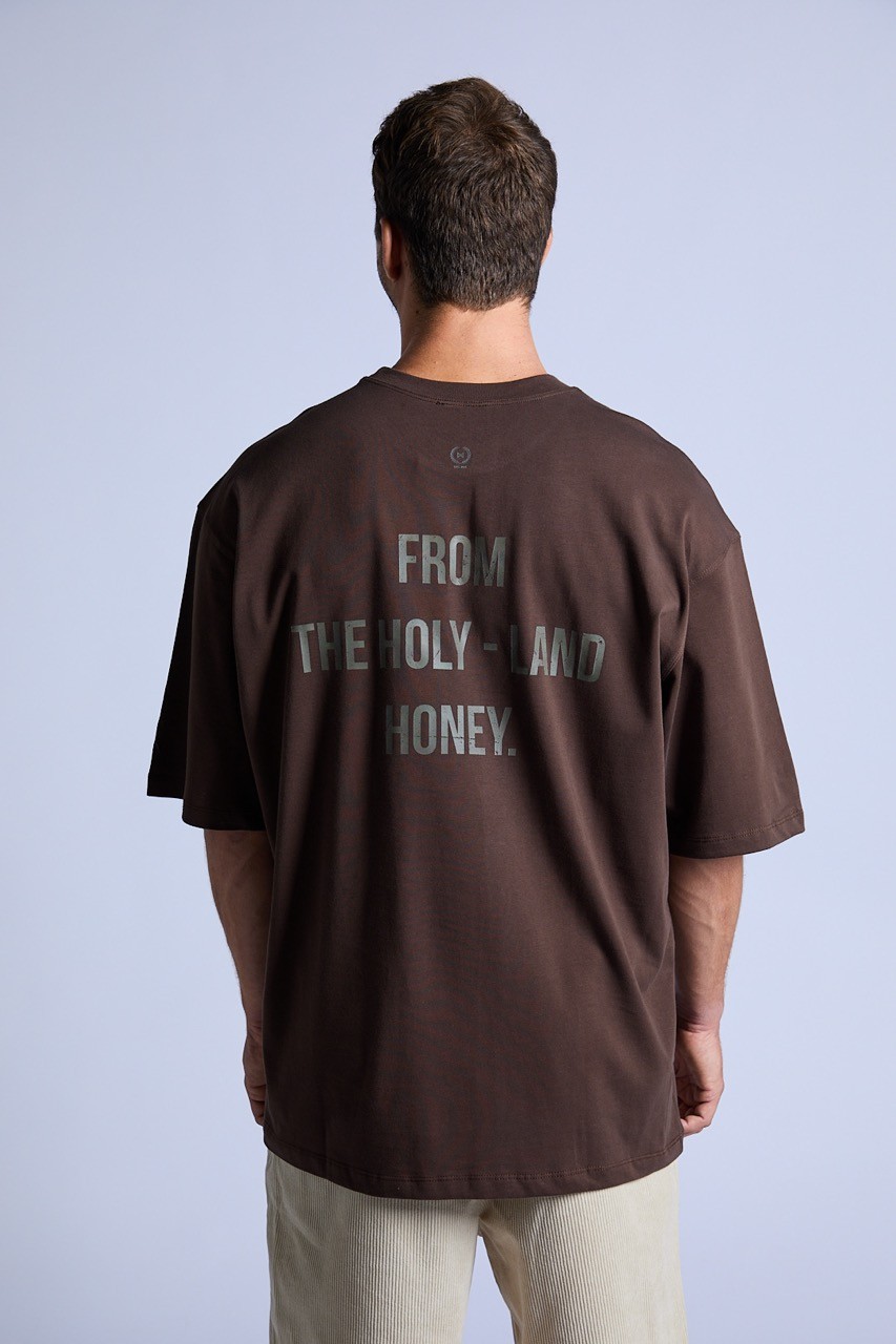 טי-שירט אוברסייז עם הדפס מלפנים ומאחור – FROM THE HOLY LAND HONEY.